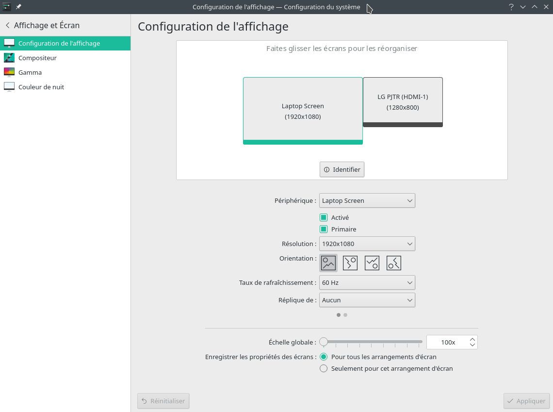 Ici, vous pouvez modifier la disposition des écran, modifier la résolution (il choisit automatiquement la meilleure possible) etc.